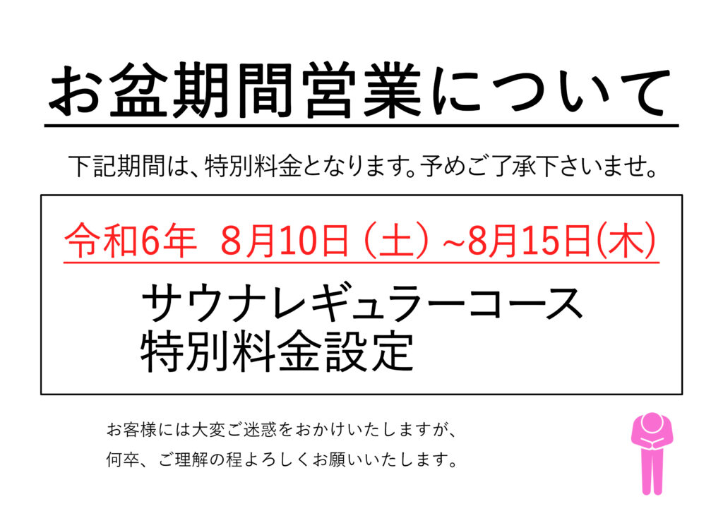【8月10日(土)~15日(木) サウナレギュラーコース特別料金設定】