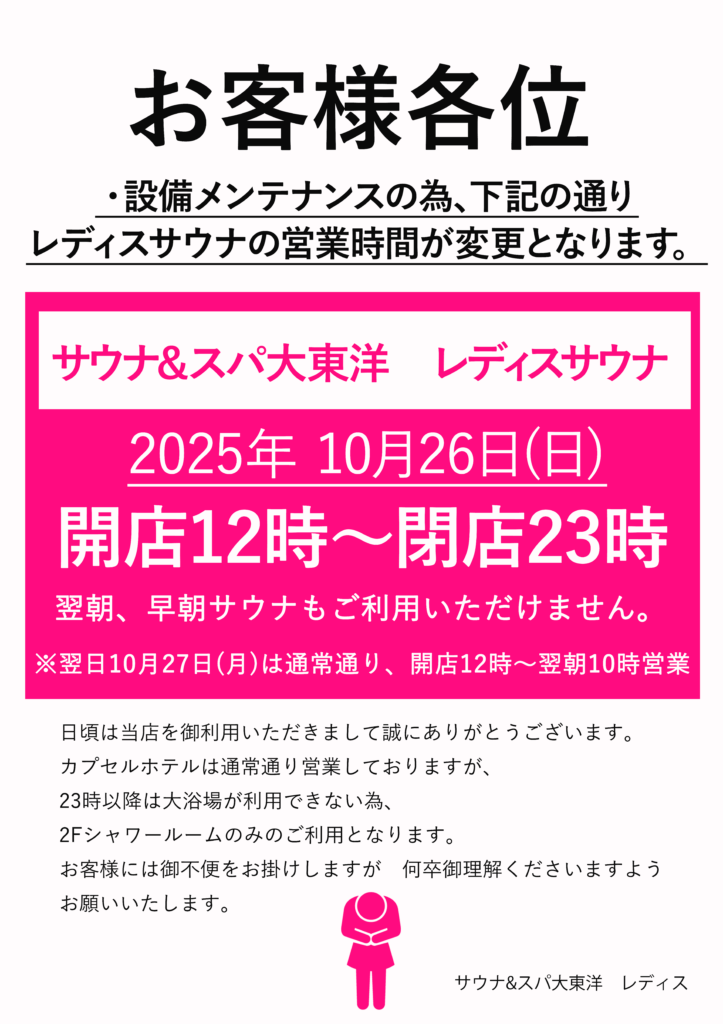 2025.10.01 お知らせ 10月26日(日)レディスサウナ23時閉館のお知らせ いつも大東洋レディスサウナをご利用いただき誠にありがとうございます。設備メンテナンスの為、レディスサウナの営業時間を下記の通り変更いたします。10/26(日) 12時~23時閉館※23時~翌朝10時までサウナでのご入館はできません。※翌日10月27日(月)は通常通り、12時よりオープンいたします。お客様にはご迷惑をおかけいたしますがご理解とご協力を宜しくお願いいたします。 一覧へもどる