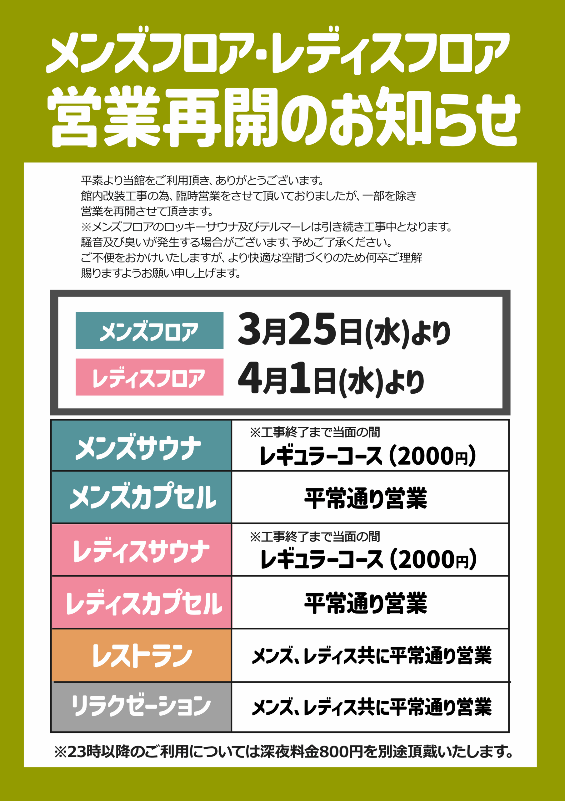 ※メンズフロアのロッキーサウナ及びテルマーレは引き続き工事中となります。